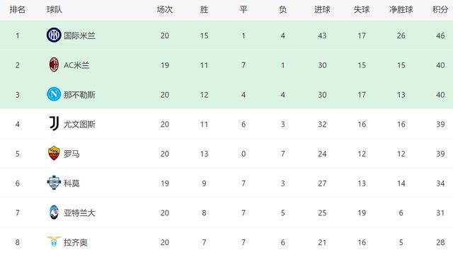 - 意甲最新积分战报 国米8轮不败6分优势领跑 那不勒斯追上AC米兰